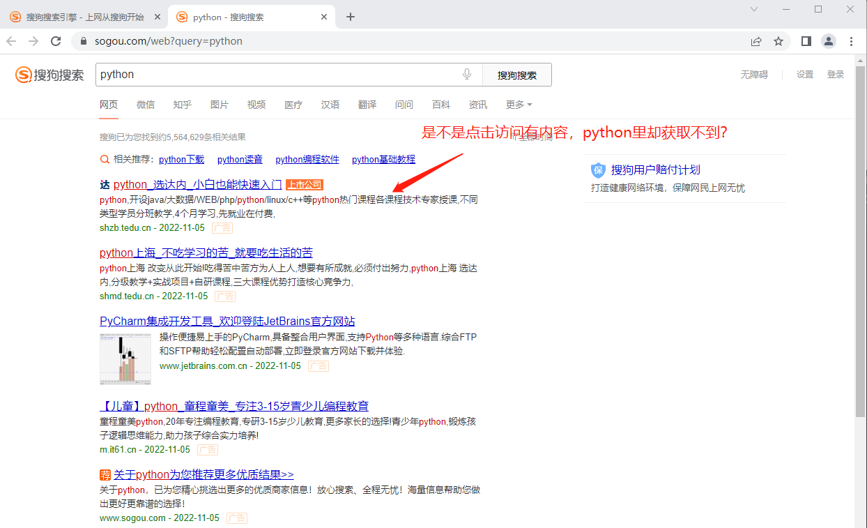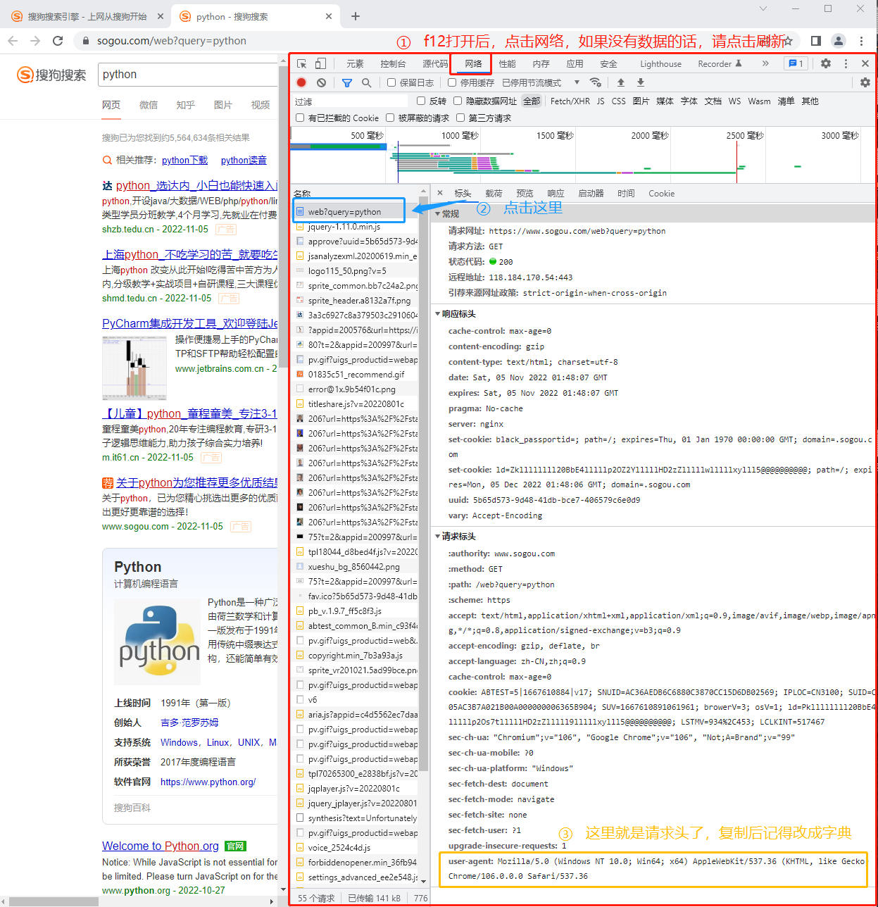 # 导入request模块 import requests # requests 的核心功能就是发送请求 url = "https://www.sogou.com/web?query=python" # 发送请求 resp = requests.get(url) # get请求 # requests.post() # post请求 # 获得状态码 print(resp) # 获得网面源代码 page_resp = resp.text print(page_resp) # 仔细看看是不是获得的数据与期望得到的不一样? # 是因为被网页识别出我们的访问方式有问题 print(resp.request.headers) # 查看自己的请求头,很容易就发现自己是通过python访问,所以被浏览器拒绝了。 # 开始修改请求头,首先要获得请求头(具体下面有图片) headers = { # 下面的内容不要手写, 复制粘贴最安全 "user-agent": "Mozilla/5.0 (Windows NT 10.0; Win64; x64) AppleWebKit/537.36 (KHTML, like Gecko) Chrome/99.0.4844.82 Safari/537.36" } resp = requests.get(url, headers=headers) # 拿到页面源代码 page_resp = resp.text print(page_resp) # 终于可以获得自己想要的数据了把