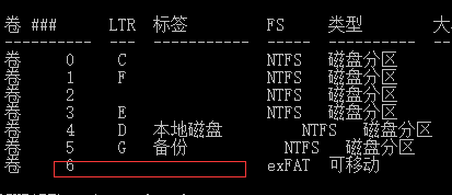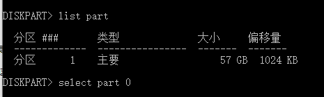 然后再执行list part,这个时候将会列出U盘里面的分区,一般U盘只有一个分区,如果只有一个分区,
