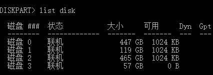那么在之前执行了diskpart命令的命令行里面执行list disk,将会列出所有磁盘的编号(类似0、1、2、3 这样的编号)和大小,