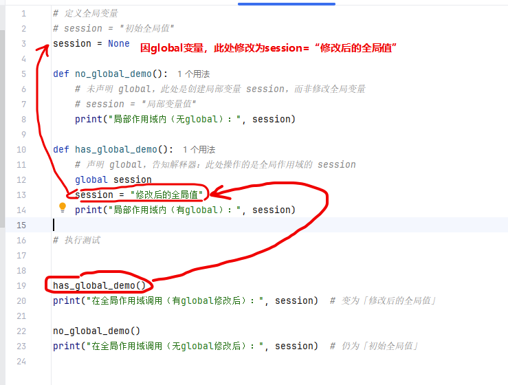 print("在全局作用域调用(无global修改后):", session) # 仍为「初始全局值」