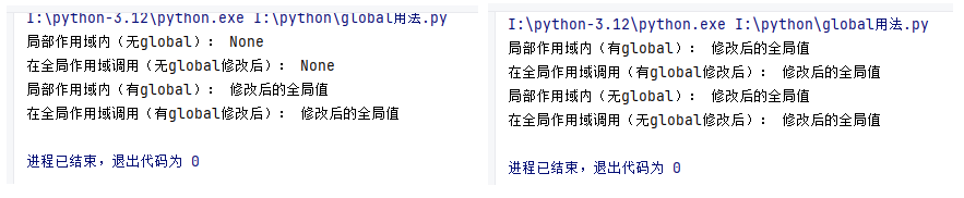 所以说,先后执行有与无global变量的函数时,输出的结果就会不一样,这样更利于理解global变量在函数作用域中所起到的作用。