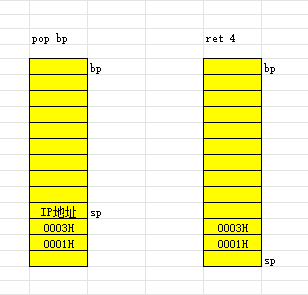 ; ret 4:子程序返回,同时将sp += 4(清理栈中之前压入的两个数值,共4字节)