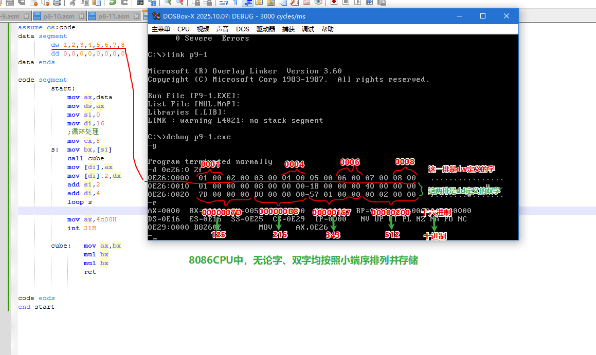 call cube ; 调用立方计算子程序(结果:dx=高16位,ax=低16位)