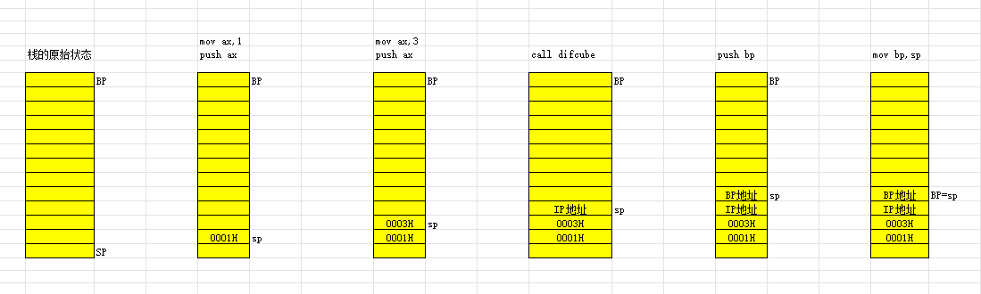 先将1压入栈中,再将3压入栈中,然后再将栈基指针BP目前状态的地址压入栈中,执行mov bp,sp是将栈基指针和栈顶指针统一,建立子程序的栈帧;