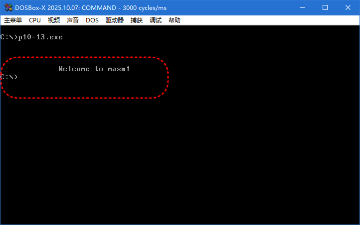 这段 8086 汇编代码的核心功能是:在 DOS 环境下,将字符串 Welcome to masm! 显示在屏幕的第 5 行、第 12 列位置。整体流程分为三步:设置光标位置 → 输出字符串 → 程序退出。