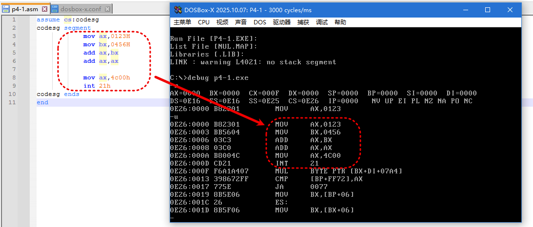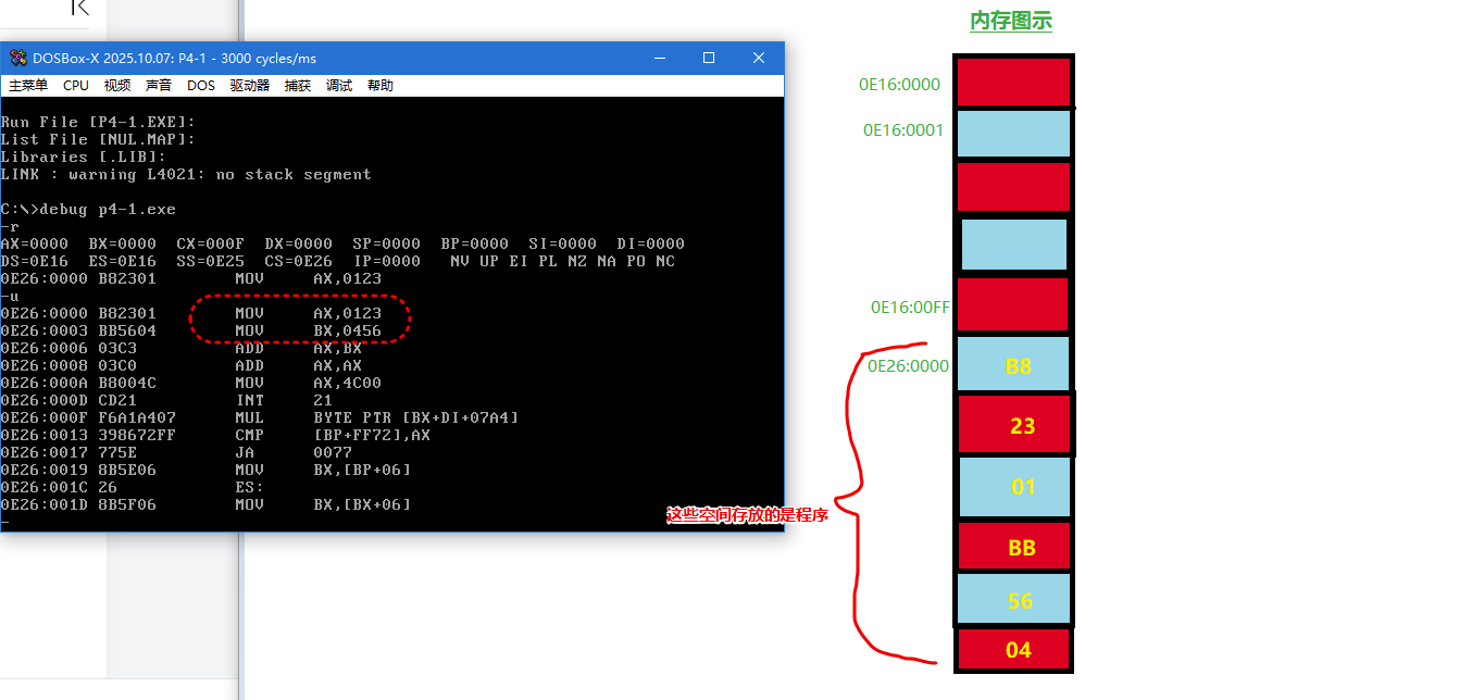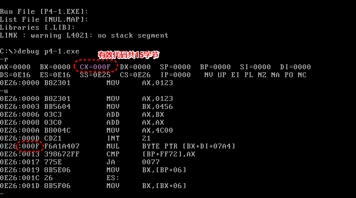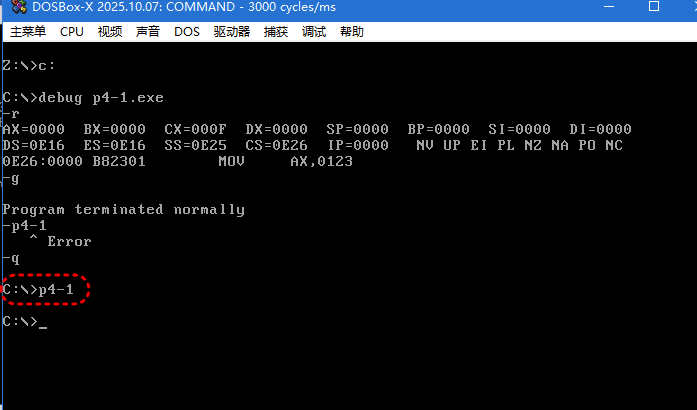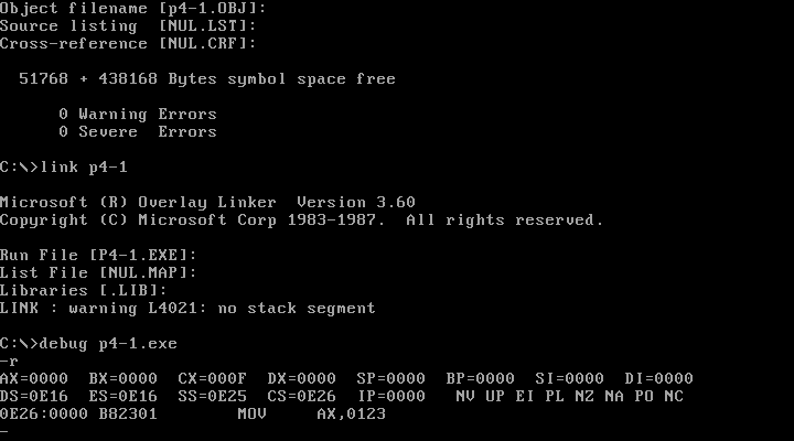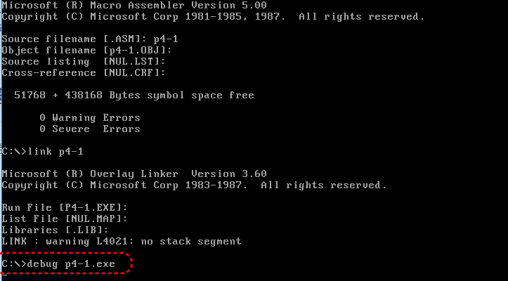 上一篇文章中,已经安装好MASM5.0汇编器,并将p4-1.asm编译成了exe文件,本节我们继续学习debug跟踪功能。