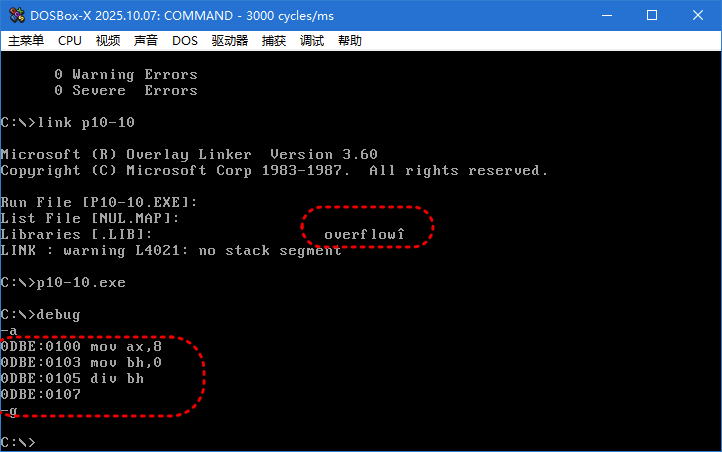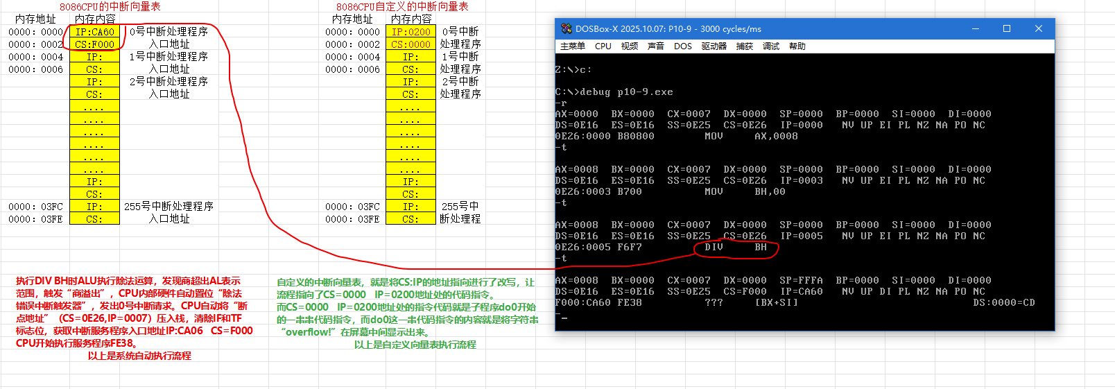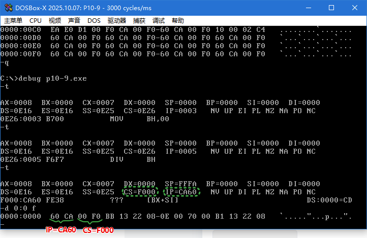 因此你在 DOSBox-X 中看到的CS=F000H、IP=CA60H,正是 CPU 从 IVT 中读取的、BIOS 预设的 “除法错误中断服务程序” 入口地址。