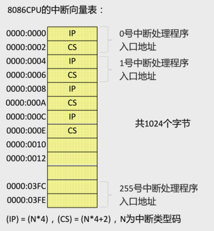 向量表地址 = 0×4 = 0000:0000 → 需读取0000:0000(IP)和0000:0002(CS),这两个值决定了中断服务程序的入口。