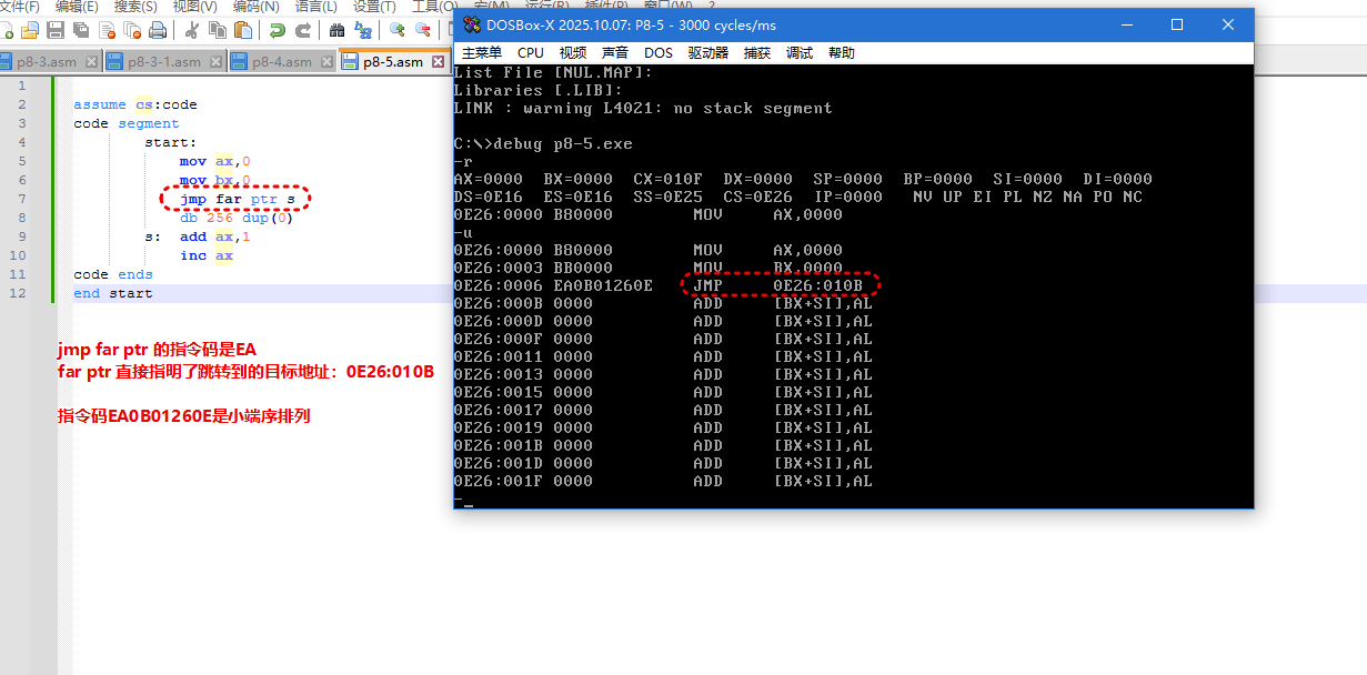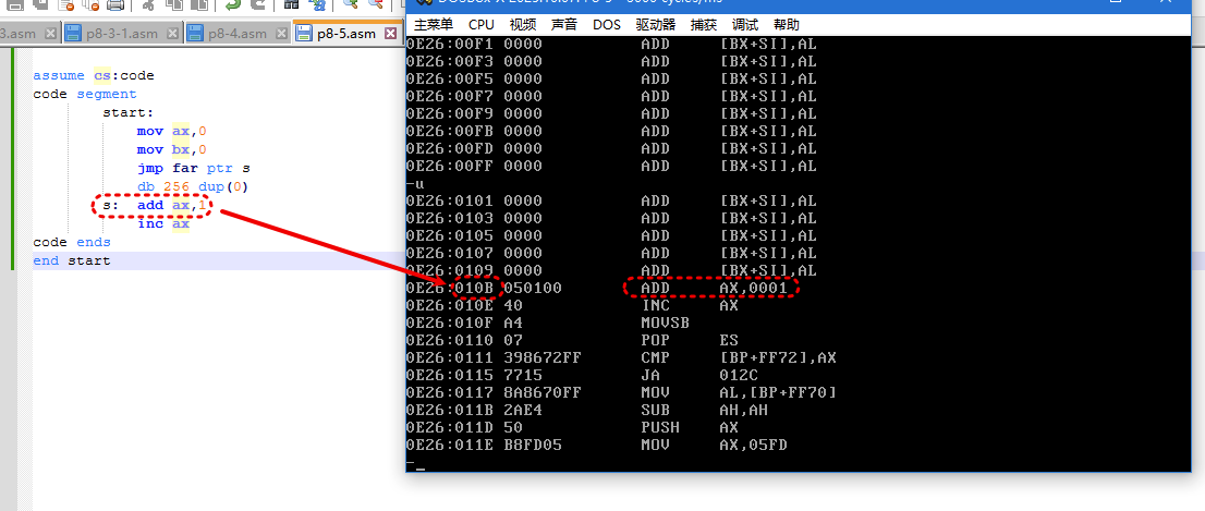由上可见 ,far ptr 跳转所指向的0E26:010B处,就是add ax,1