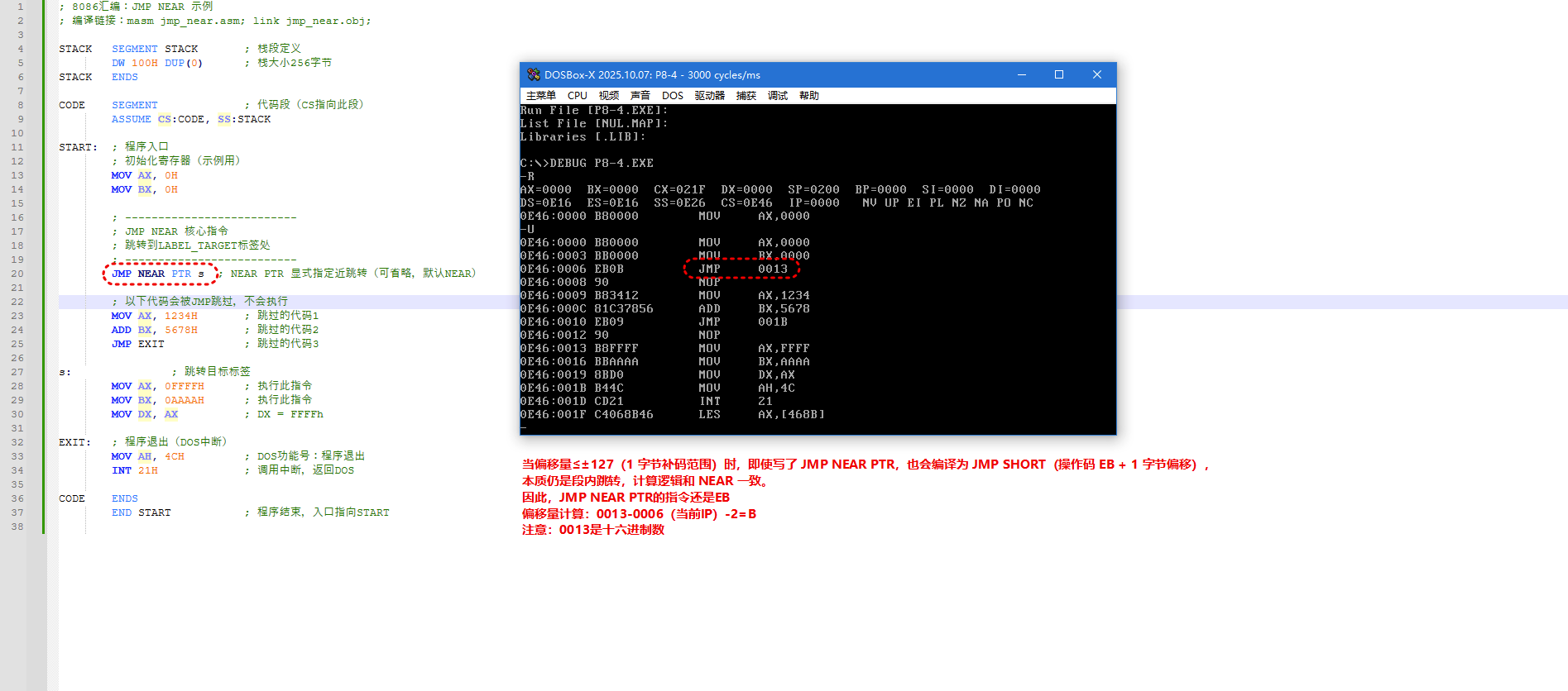 | 段内近跳转 | JMP NEAR PTR 标号 | 近跳转:偏移量为 16 位有符号数(范围:-32768 ~ +32767),默认段内跳转 |