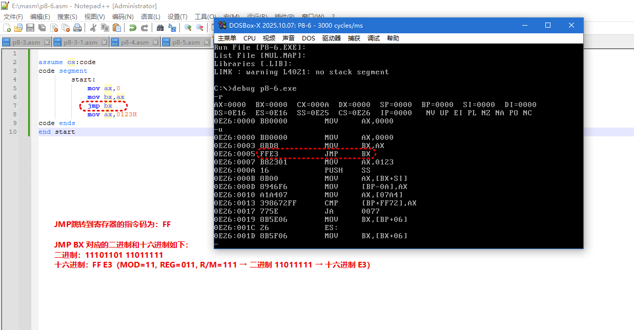 | 段内寄存器寻址 | JMP REG | 跳转目标偏移地址直接存放在 16 位寄存器中(如 JMP AX) |
