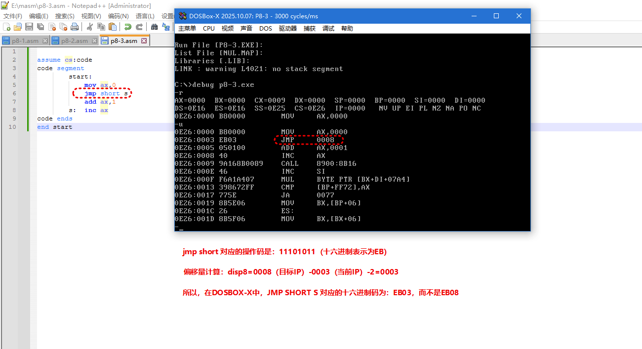 上述两例均验证了,jmp short s的机器指令中,如EB03/EB05,包含的是跳转到指令的相对位置,而不是转移的目标地址。