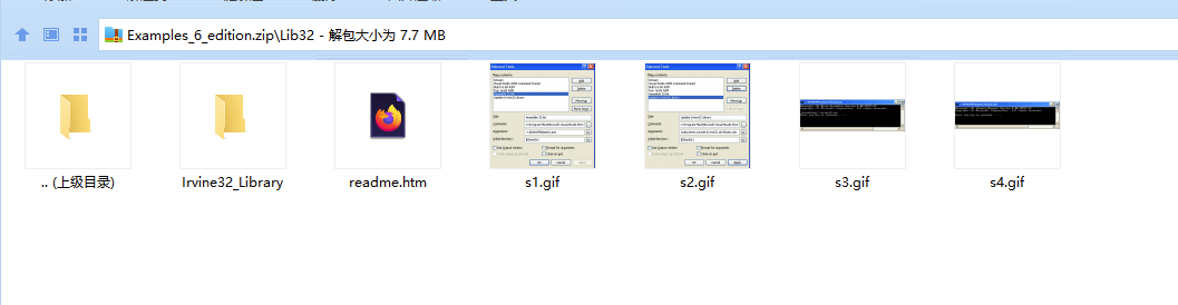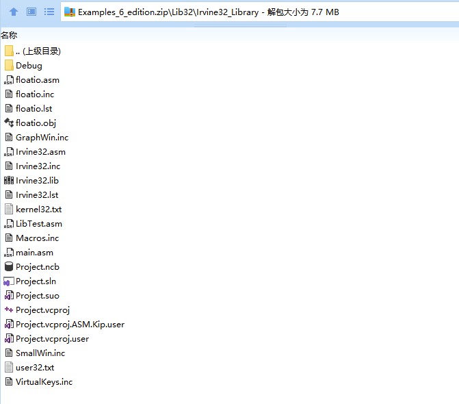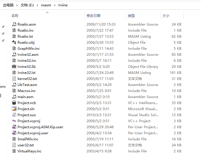 将压缩包中Irvine_Library文件夹中的文件全部释放到E:\masm\Irvine中,如下图所示: