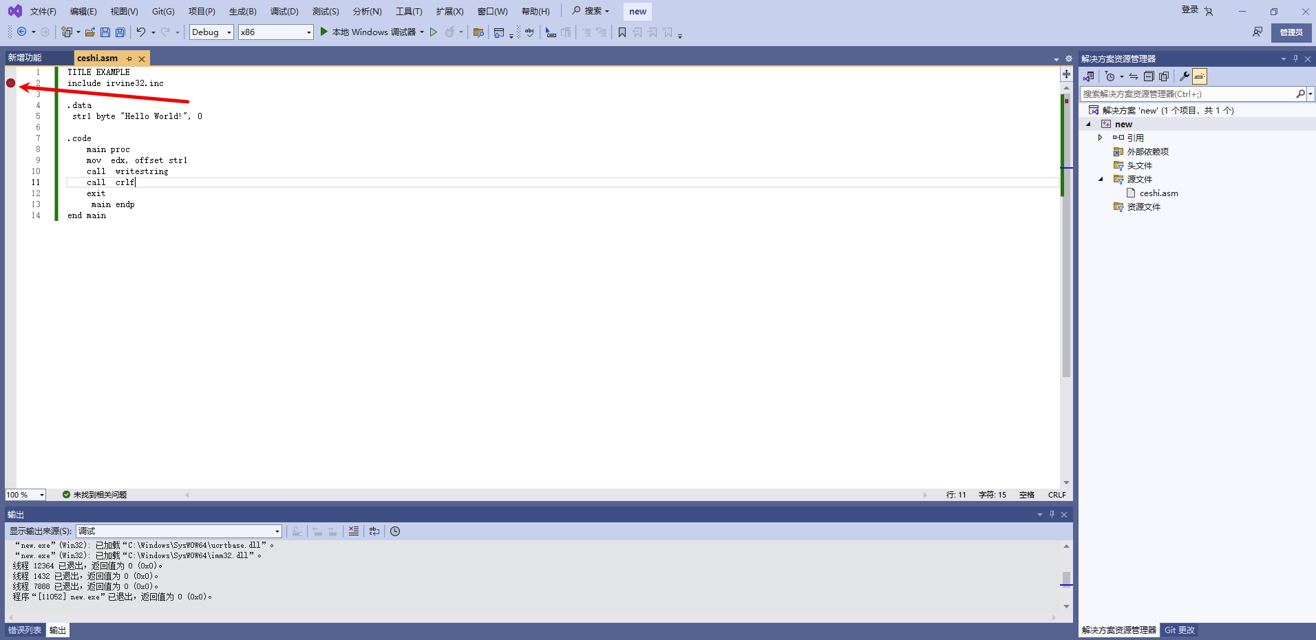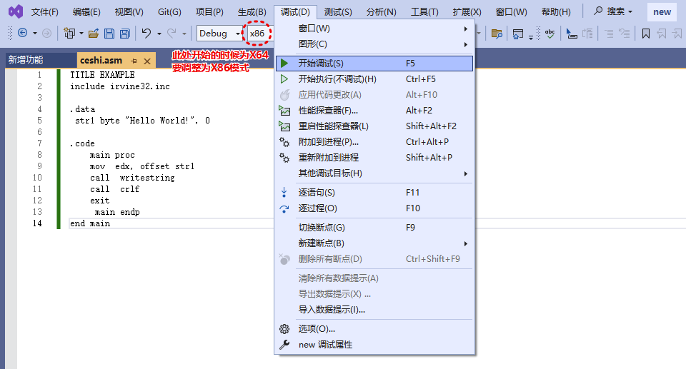 上述配置完成后,用汇编代码测试一下效果,如下: