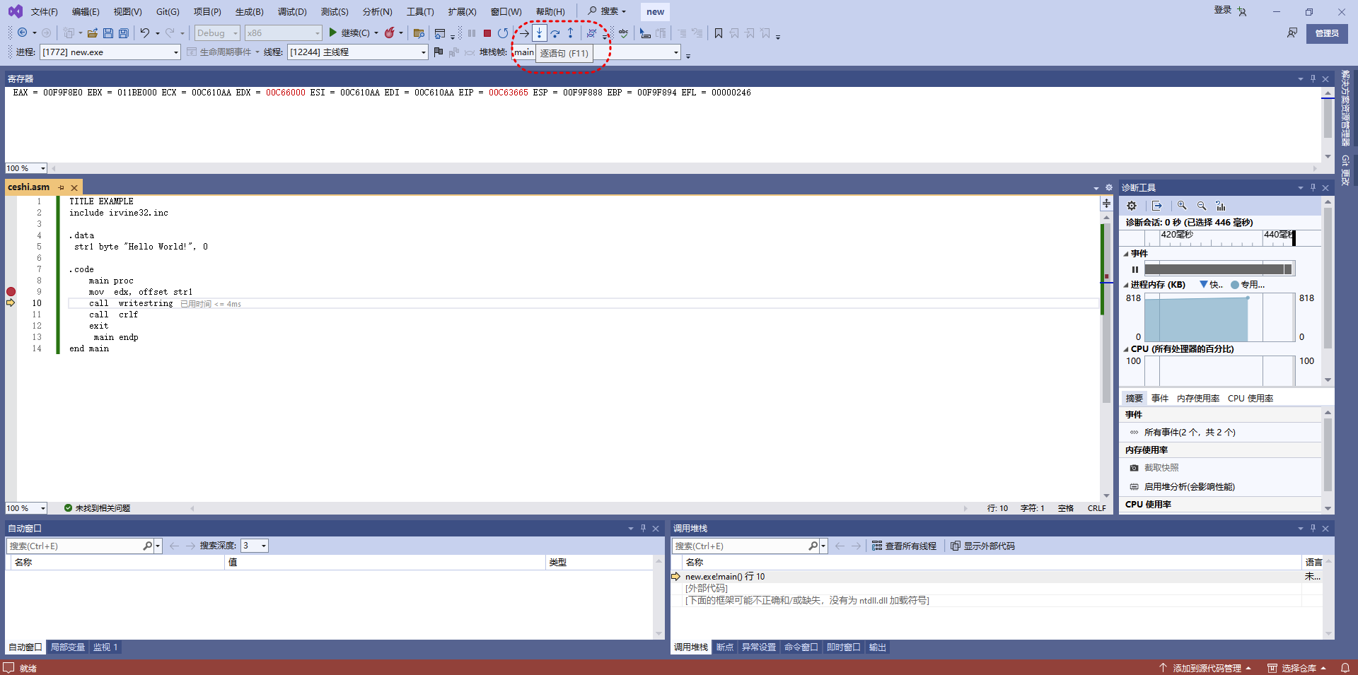 或者点击上方的菜单栏,可以逐语句、逐过程地调试汇编代码。
