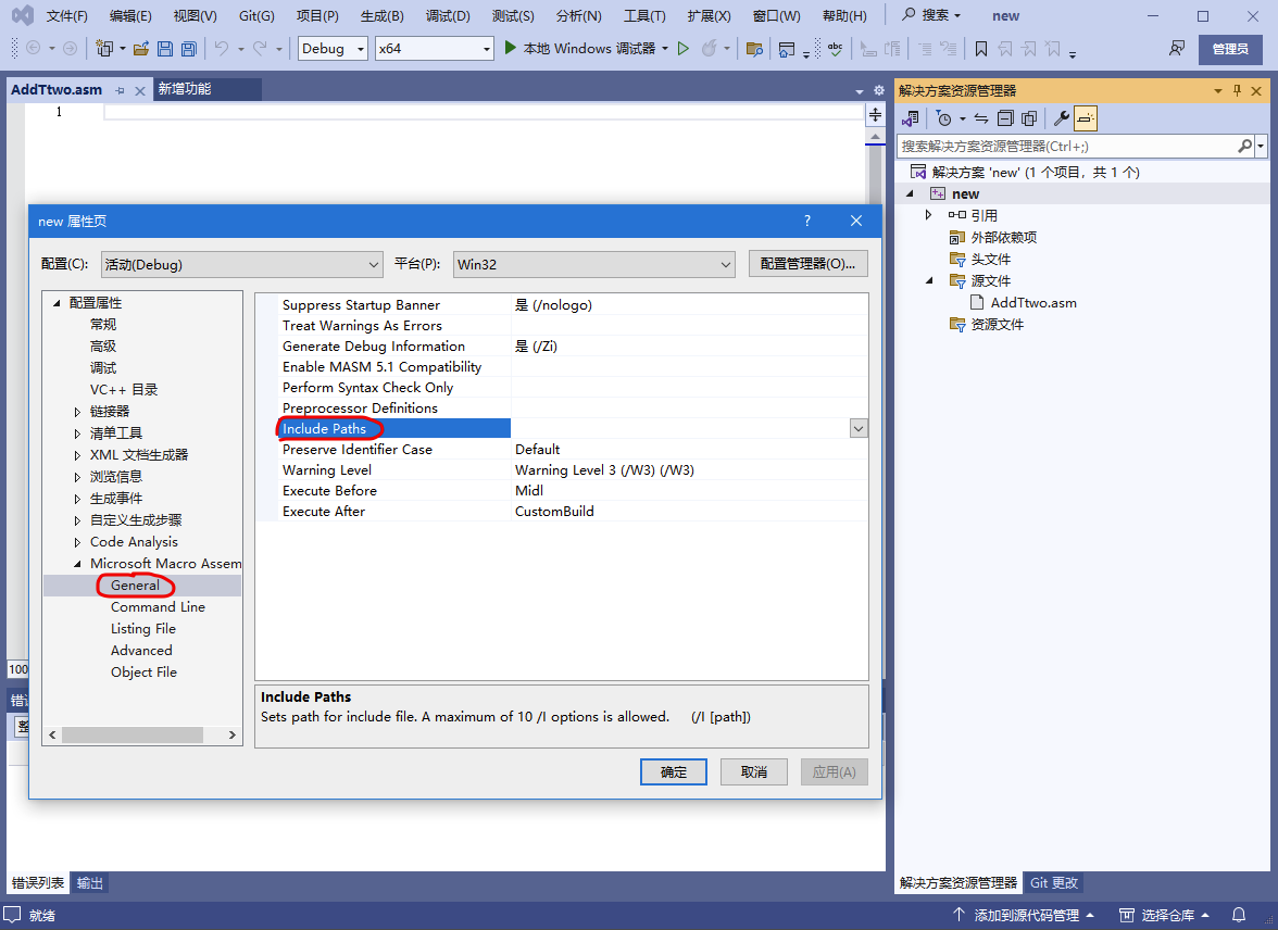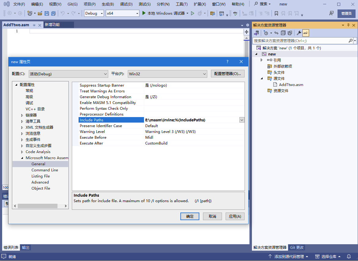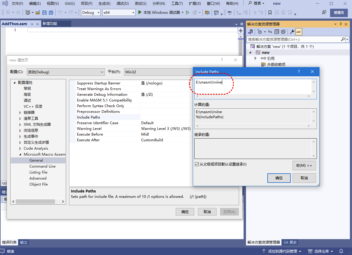 打开解决方案资源管理器 --> 右击项目名称 --> 选择属性(最下面) --> 选择 Microsoft Macro Assembler --> Include Paths --> 编辑 --> 添加irvine库目录 (如 下图):