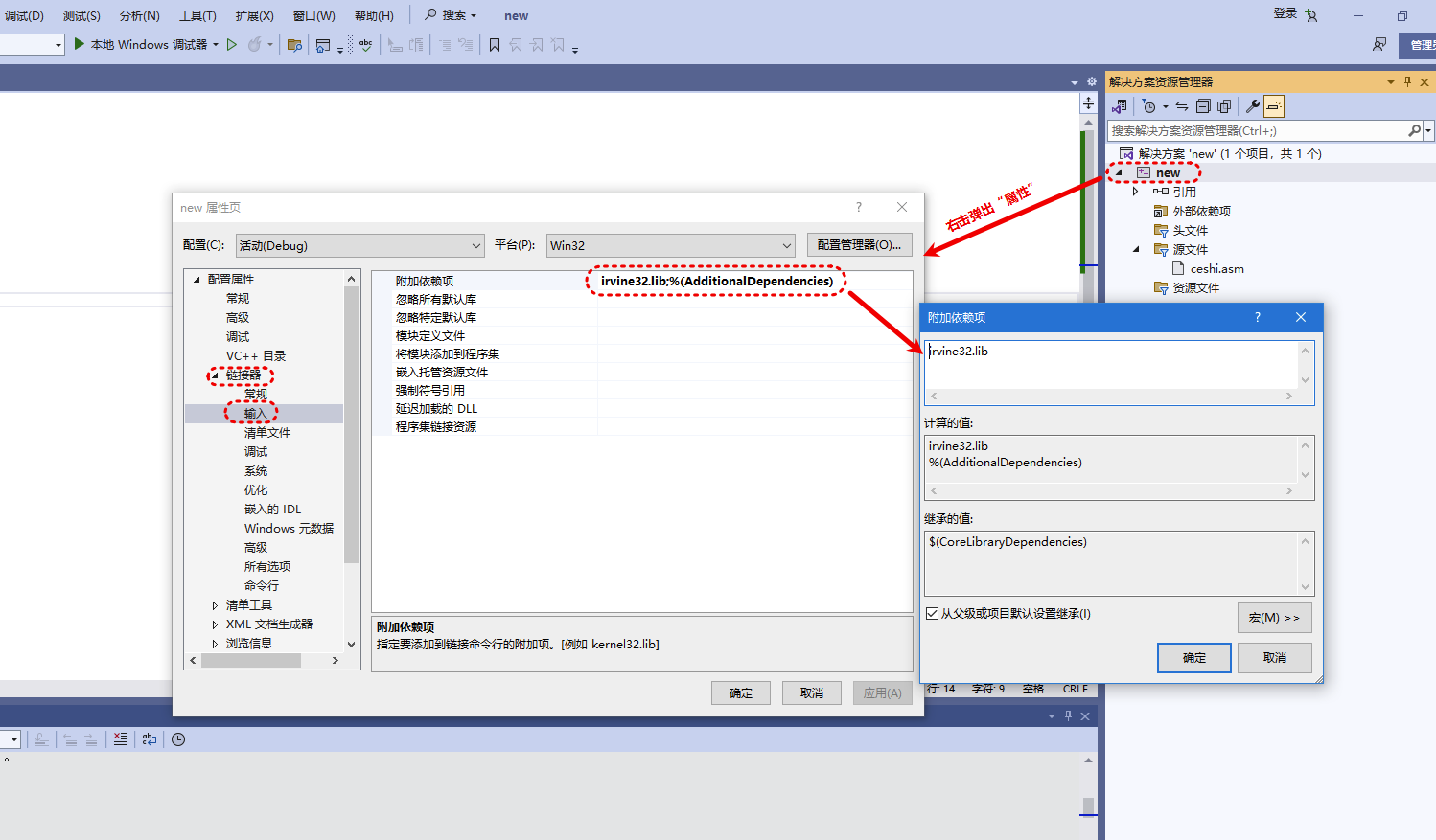 打开解决方案资源管理器 --> 右击项目名称 --> 选择属性(最下面) --> 选择“链接器” --> 选择 “输入” --> 选择“附加依赖项” --> 编辑 --> 直接编辑写入 irvine32.lib:
