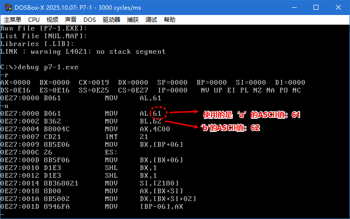 mov al,'a' ; al = 61H(字符'a'的ASCII码)