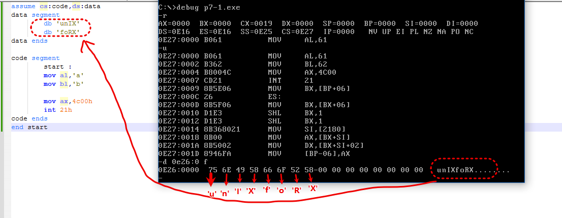 db 'foRX' ; 定义4字节字符串:f(66H)、o(6FH)、R(52H)、X(58H)