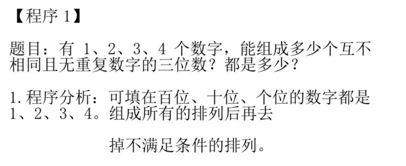 1 #include<stdio.h> 2 3 int main() 4 { 5 int a, b, c; 6 int i; 7 int sum = 0; 8 9 for (a = 1; a < 5; a++) 10 { 11 for(b = 1; b < 5; b++) 12 { 13 for(c = 1; c < 5; c++) 14 { 15 if(a != b && b != c && c != a) 16 { 17 i = a * 100 + b * 10 + c; 18 printf("%d\n", i); 19 sum++; 20 } 21 } 22 } 23 } 24 printf("共有%d个", sum); 25 26 return 0; 27 }