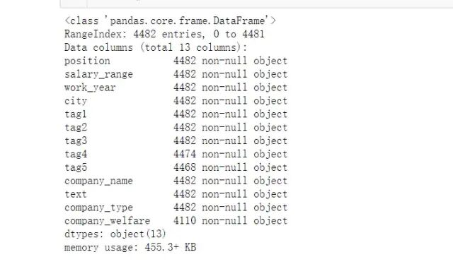 总共有4482条数据。tag4、tag5、company_walfare列的有存在空缺数据,但空缺不多,而且这三个指标不是关键性指标,所以暂不做处理