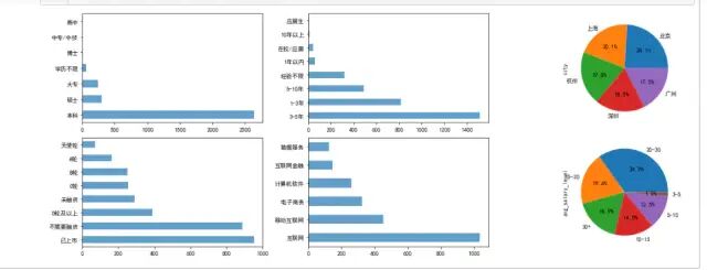 plt.figure(figsize=(16,6)) plt.rcParams['font.sans-serif']=['SimHei'] #用来正常显示中文标签 plt.rcParams['axes.unicode_minus']=False #用来正常显示负号 #学历 plt.subplot(2,3,1) df_full_time.education_background.value_counts().plot(kind='barh',alpha=0.7) #工作经验 plt.subplot(2,3,2) df_full_time.work_year.value_counts().plot(kind='barh',alpha=0.7) #岗位分布 plt.subplot(2,3,3) df_full_time.city.value_counts().plot(kind='pie',autopct='%.1f%%') #公司融资情况 plt.subplot(2,3,4) df_full_time.company_financing .value_counts().plot(kind='barh',alpha=0.7) #公司类别 plt.subplot(2,3,5) df_full_time.company_type.value_counts().head(6).plot(kind='barh',alpha=0.7) #薪水 plt.subplot(2,3,6) #对薪水划分层次,如18K属于15-10 bins=[0,3,5,10,15,20,30,105] level=['0-3','3-5','5-10','10-15','15-20','20-30','30+'] df_full_time['avg_salary_level']=pd.cut(df_full_time.avg_salary,bins=bins,labels=level) df_full_time.avg_salary_level.value_counts().head(6).plot(kind='pie',autopct='%.1f%%') #调整子图的间距 plt.tight_layout()