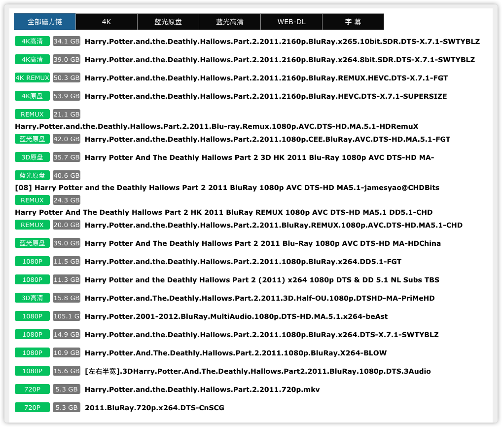 打开自己想要下载的影片,然后可以看到全部的磁力链接,也可以查看是否拥有4K,蓝光,字幕等一系列资源链接。