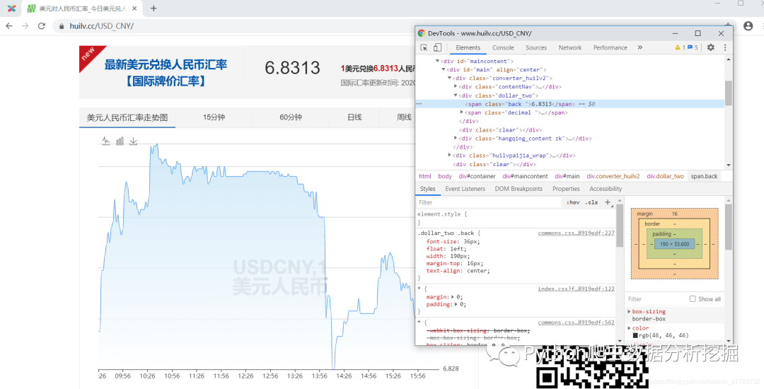 import requests from lxml import etree headers = { "User-Agent": "Mozilla/5.0 (Windows NT 10.0; Win64; x64) AppleWebKit/537.36 (KHTML, like Gecko) Chrome/84.0.4147.89 Safari/537.36" } url = "https://www.huilv.cc/USD_CNY/" def Get_huilv(url, headers1): res = requests.get(url=url, headers=headers1, timeout=2) # print(res.status_code)#打印状态码 html = etree.HTML(res.text) USD_VS_RMB_0 = html.xpath('//div[@id="main"]/div[1]/div[2]/span[1]/text()') for a in USD_VS_RMB_0: b = a USD_VS_RMB_1 = float(b) print("实时汇率为:{}".format(USD_VS_RMB_1))