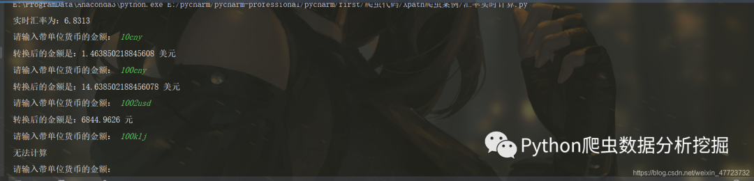 # -*- coding : utf-8 -*- import requests from lxml import etree headers = { "User-Agent": "Mozilla/5.0 (Windows NT 10.0; Win64; x64) AppleWebKit/537.36 (KHTML, like Gecko) Chrome/84.0.4147.89 Safari/537.36" } url = "https://www.huilv.cc/USD_CNY/" def Get_huilv(url, headers1): res = requests.get(url=url, headers=headers1, timeout=2) # print(res.status_code)#打印状态码 html = etree.HTML(res.text) USD_VS_RMB_0 = html.xpath('//div[@id="main"]/div[1]/div[2]/span[1]/text()') for a in USD_VS_RMB_0: b = a USD_VS_RMB_1 = float(b) print("实时汇率为:{}".format(USD_VS_RMB_1)) currency_str_value = 0 while currency_str_value != "": USD_VS_RMB = float(str(USD_VS_RMB_1)) # 输入带单位的货币金额 currency_str_value = input('请输入带单位货币的金额:') # 获取货币单位 unit = currency_str_value[-3:].upper() # 第一次判断 if unit == 'CNY': exchange_rate = 1 / USD_VS_RMB string = "美元" elif unit == 'USD': exchange_rate = USD_VS_RMB string = "元" else: exchange_rate = -1 if exchange_rate != -1: in_money = eval(currency_str_value[0:-3]) # 使用lambda定义函数 convert_currency2 = lambda x: x * exchange_rate # 调用lambda函数 out_money = convert_currency2(in_money) print('转换后的金额是:{} {} '.format(out_money, string)) else: print('无法计算') Get_huilv(url, headers)