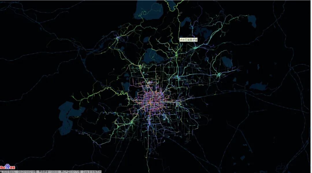BAIDU_MAP_AK = "输入你自己的秘钥" c = ( BMap(init_opts=opts.InitOpts(width="1200px", height="800px")) .add_schema( baidu_ak=BAIDU_MAP_AK, center=[116.40, 40.04], zoom=10, is_roam=True, map_style={ "styleJson": [ { "featureType": "water", "elementType": "all", "stylers": {"color": "#031628"}, }, “省略部分修饰代码” ) .add( "", type_="lines", is_polyline=True, data_pair=result, linestyle_opts=opts.LineStyleOpts(opacity=0.2, width=0.5,color='red'), # 如果不是最新版本的话可以注释下面的参数(效果差距不大) progressive=200, progressive_threshold=500, ) ) c.render_notebook()