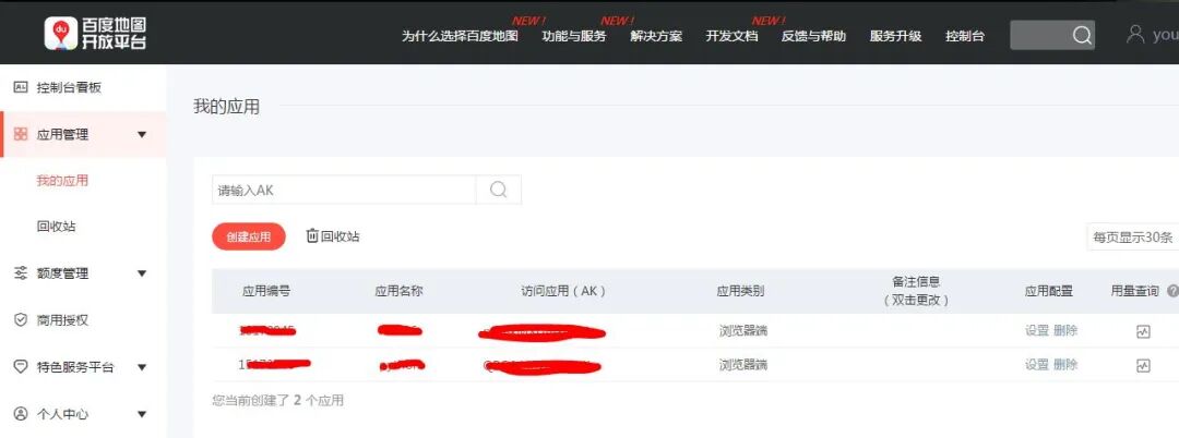 有账号的直接登录,没账号的先注册一下再登录,登录完成后,依次点击控制台-应用管理-我的应用-创建应用: