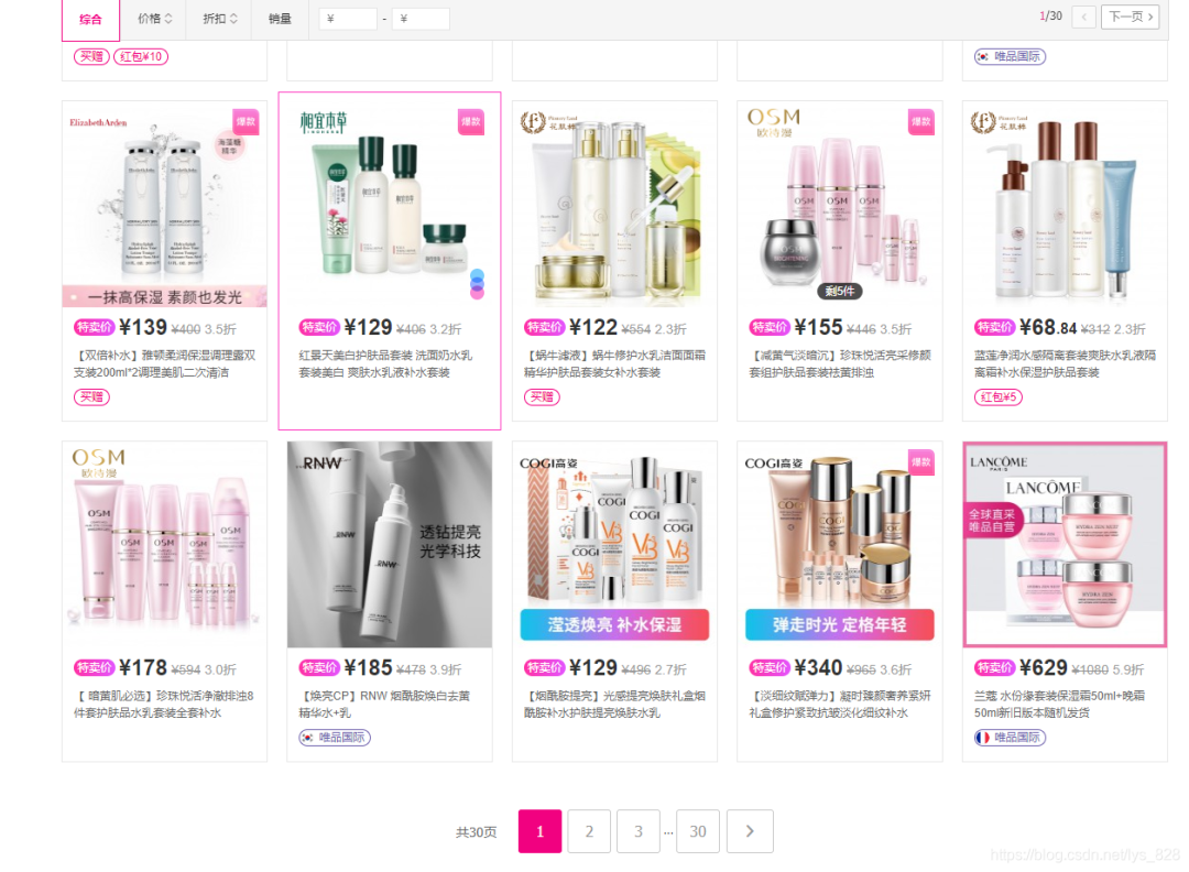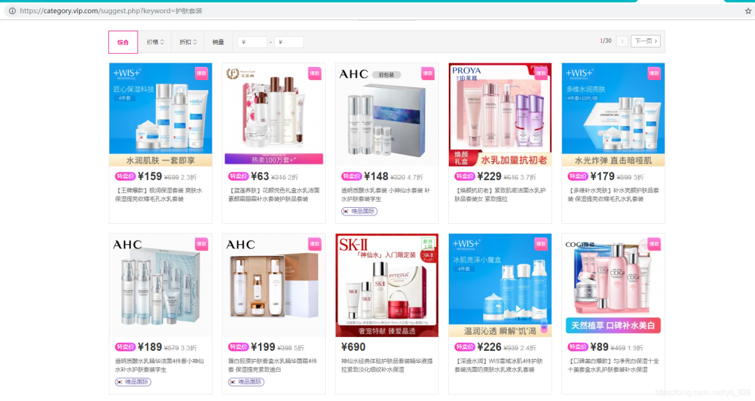 唯品会官网中假如搜索护肤套装,返回的页面如下