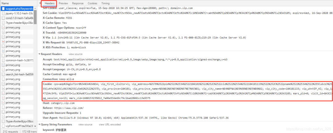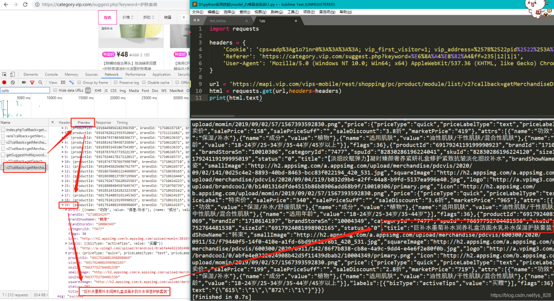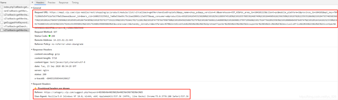 import requests headers = { 'Cookie': 'vip_city_code=104101115; vip_wh=VIP_HZ; vip_ipver=31; user_class=a; mars_sid=ff7be68ad4dc97e589a1673f7154c9f9; VipUINFO=luc%3Aa%7Csuc%3Aa%7Cbct%3Ac_new%7Chct%3Ac_new%7Cbdts%3A0%7Cbcts%3A0%7Ckfts%3A0%7Cc10%3A0%7Crcabt%3A0%7Cp2%3A0%7Cp3%3A1%7Cp4%3A0%7Cp5%3A0%7Cul%3A3105; mars_pid=0; visit_id=98C7BA95D1CA0C0E518537BD0B4ABEA0; vip_tracker_source_from=; pg_session_no=5; mars_cid=1600153235012_7a06e53de69c79c1bad28061c13e9375', 'Referer': 'https://category.vip.com/suggest.php?keyword=%E6%8A%A4%E8%82%A4&ff=235|12|1|1', 'User-Agent': 'Mozilla/5.0 (Windows NT 10.0; Win64; x64) AppleWebKit/537.36 (KHTML, like Gecko) Chrome/75.0.3770.100 Safari/537.36' } url = 'https://mapi.vip.com/vips-mobile/rest/shopping/pc/product/module/list/v2?callback=getMerchandiseDroplets3&app_name=shop_pc&app_version=4.0&warehouse=VIP_HZ&fdc_area_id=104101115&client=pc&mobile_platform=1&province_id=104101&api_key=70f71280d5d547b2a7bb370a529aeea1&user_id=&mars_cid=1600153235012_7a06e53de69c79c1bad28061c13e9375&wap_consumer=a&productIds=6918324165453150280%2C6918256118899745105%2C6918357885382468749%2C6918449056102396358%2C6918702822359352066%2C6918479374036836673%2C6918814278458725896%2C6918585149106754305%2C6918783763771922139%2C6917924417817122013%2C6918747787667990790%2C6918945825686792797%2C6918676686121468885%2C6918690813799719966%2C6917924776628925583%2C6918808484587649747%2C6918524324182323338%2C6917924083191145365%2C6917924119199990923%2C6917924081998898069%2C&scene=search&standby_id=nature&extParams=%7B%22stdSizeVids%22%3A%22%22%2C%22preheatTipsVer%22%3A%223%22%2C%22couponVer%22%3A%22v2%22%2C%22exclusivePrice%22%3A%221%22%2C%22iconSpec%22%3A%222x%22%7D&context=&_=1600158865440' html = requests.get(url,headers=headers) print(html.text)
