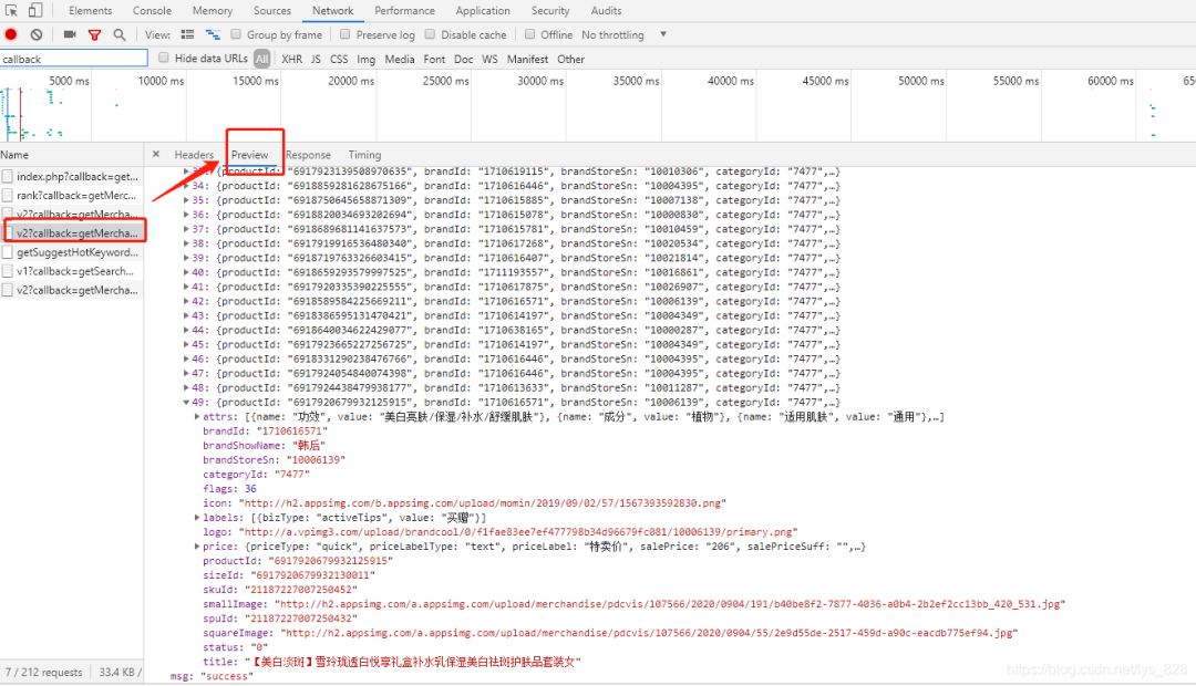 尝试进行抓包,获取真实商品数据所在的网址页面,首先鼠标右键进入检查界面,点击Network后刷新页面,这时候就会返回请求的信息,需要进行查找筛选,找到具体含有商品信息的链接文件,经过检查发现内容大多在callback有关的文件中,如下