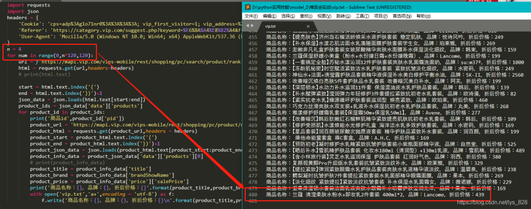 这里假使n=4,再次运行代码,输出的结果如下:(为了查看数据量,使用sublime打开txt文件,可以发现刚好是4页商品的数量总和,因此整个唯品会商品的信息的爬取至此完结)