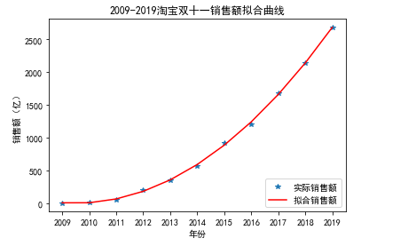 # -*- coding: utf-8 -*- """ Created on 2020-11-2 @author: 李运辰 """ import matplotlib as mpl import matplotlib.pyplot as plt import numpy as np mpl.rcParams['font.sans-serif'] = ['SimHei'] # 指定默认字体 '''年份''' x = np.array([year for year in range(2009,2020)]) '''实际销售额''' y = np.array([0.5,9.36,52,191,352,571,912,1207,1682.69,2135,2684]) '''用3次多项式拟合''' z1 = np.polyfit(x,y,3) p1 = np.poly1d(z1) yvals = p1(x) plot1 = plt.plot(x,y,'*',label=u"实际销售额") plot2 = plt.plot(x,yvals,'r',label=u"拟合销售额") plt.xticks(x) plt.xlabel(u'年份') plt.ylabel(u'销售额(亿)') plt.title(u'2009-2019淘宝双十一销售额拟合曲线') plt.legend(loc=4) plt.figure(figsize=(10,10)) plt.show() print("拟合多项式:",p1) p1 = np.poly1d(z1) print("_"*40) print("2020年预测值:",p1(2020)) print('2021年预测值:',p1(2021))