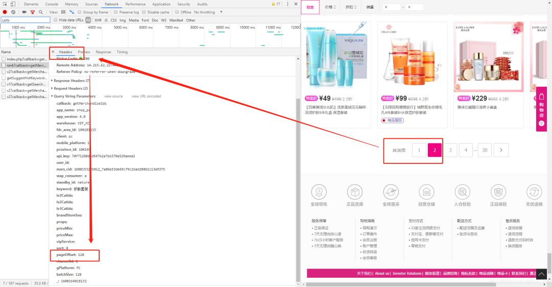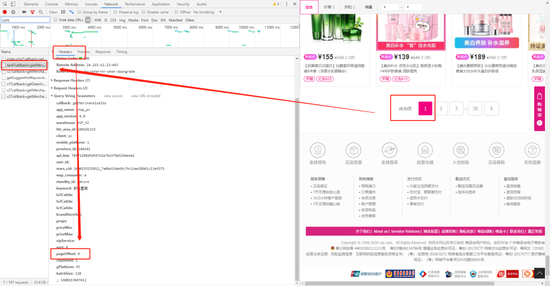url = f'https://mapi.vip.com/vips-mobile/rest/shopping/pc/search/product/rank?callback=getMerchandiseIds&app_name=shop_pc&app_version=4.0&warehouse=VIP_HZ&fdc_area_id=104101115&client=pc&mobile_platform=1&province_id=104101&api_key=70f71280d5d547b2a7bb370a529aeea1&user_id=&mars_cid=1600153235012_7a06e53de69c79c1bad28061c13e9375&wap_consumer=a&standby_id=nature&keyword=%E6%8A%A4%E8%82%A4%E5%A5%97%E8%A3%85&lv3CatIds=&lv2CatIds=&lv1CatIds=&brandStoreSns=&props=&priceMin=&priceMax=&vipService=&sort=0&pageOffset={num}&channelId=1&gPlatform=PC&batchSize=120&_=1600158865435'