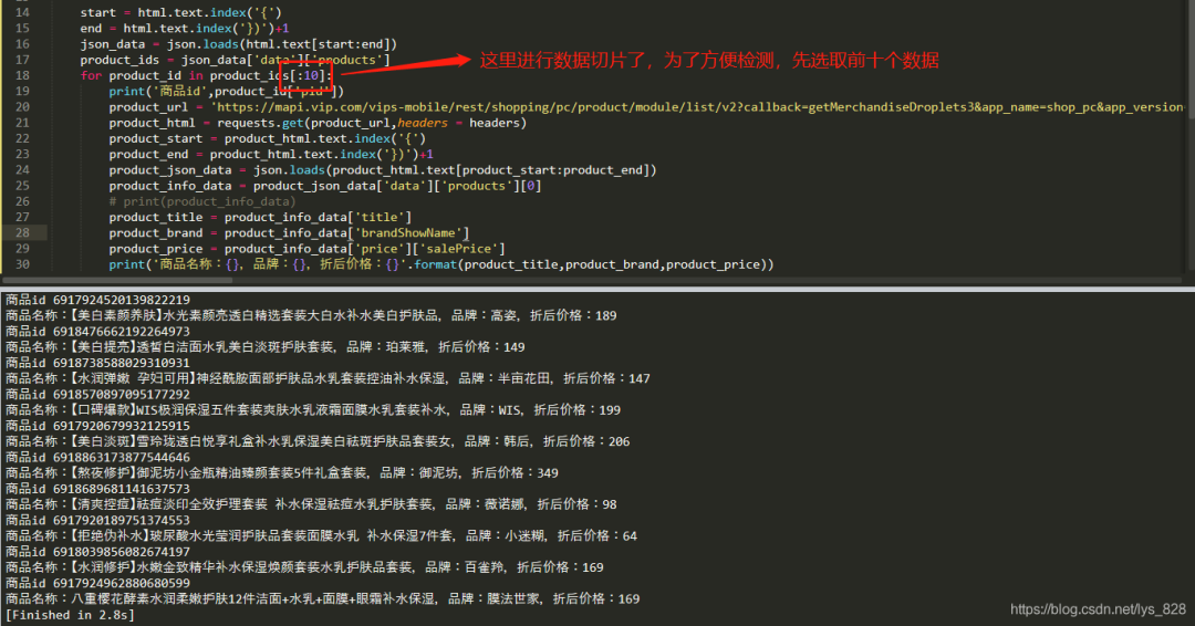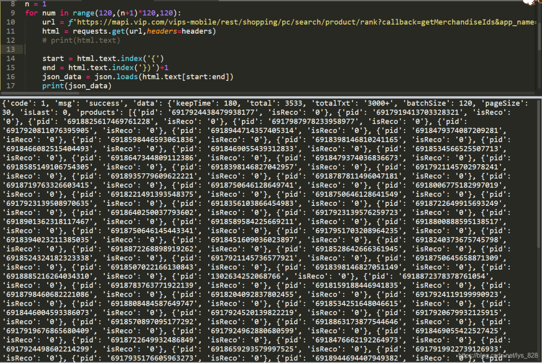 因此就可以再次遍历循环获取每一个商品的id信息了,注意这里的product_url的构造,将中间的商品id的信息全部删除然后使用format方法进行替换即可,代码如下
