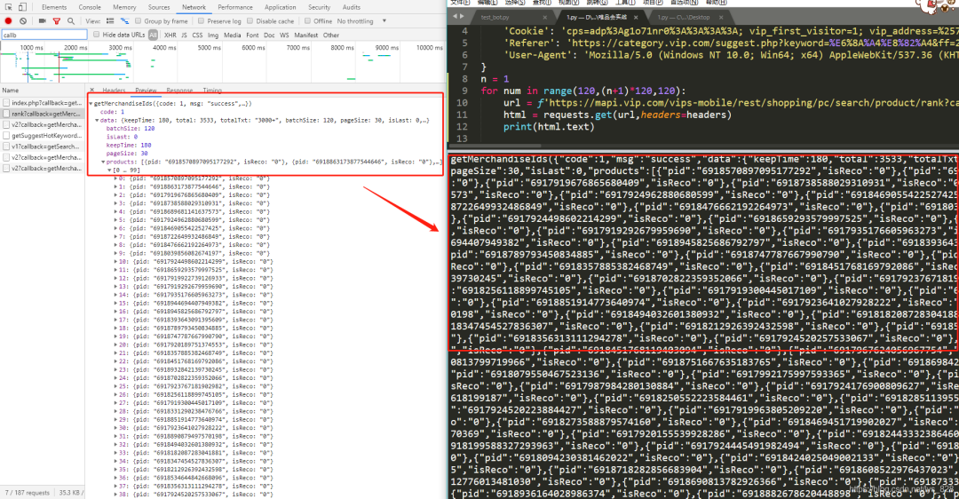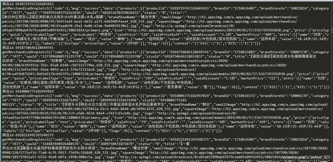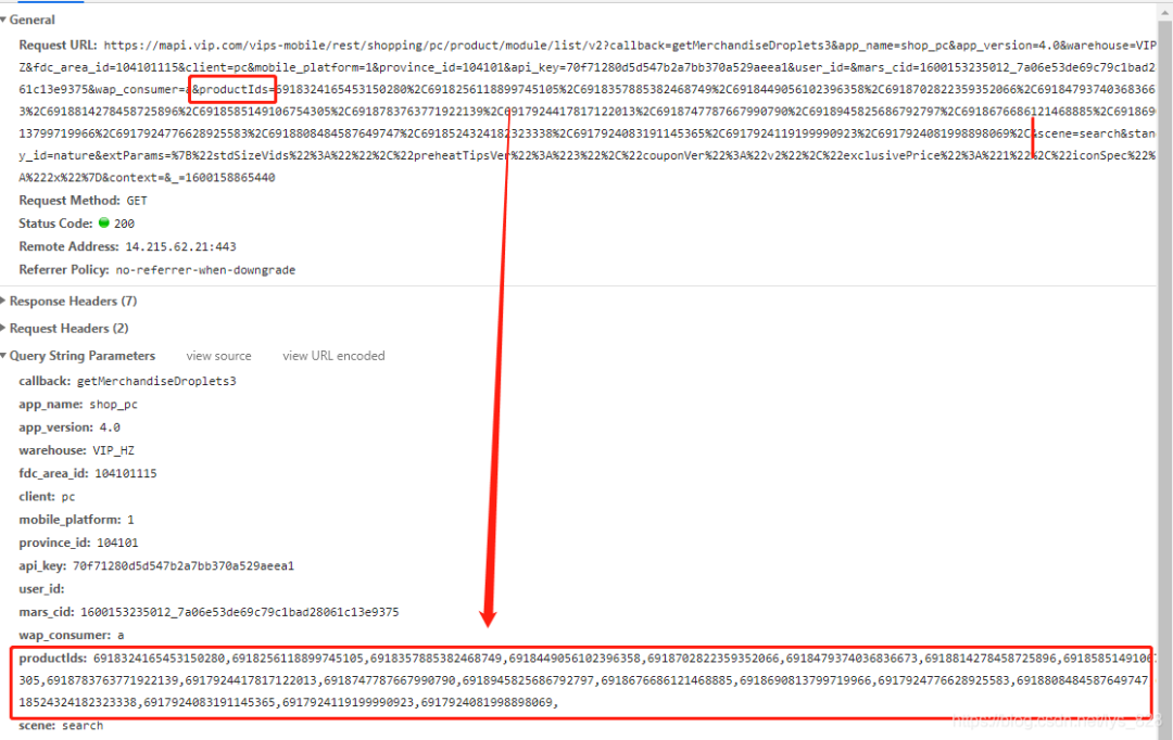 url = 'https://mapi.vip.com/vips-mobile/rest/shopping/pc/product/module/list/v2?callback=getMerchandiseDroplets3&app_name=shop_pc&app_version=4.0&warehouse=VIP_HZ&fdc_area_id=104101115&client=pc&mobile_platform=1&province_id=104101&api_key=70f71280d5d547b2a7bb370a529aeea1&user_id=&mars_cid=1600153235012_7a06e53de69c79c1bad28061c13e9375&wap_consumer=a&productIds=6918324165453150280%2C6918256118899745105%2C6918357885382468749%2C6918449056102396358%2C6918702822359352066%2C6918479374036836673%2C6918814278458725896%2C6918585149106754305%2C6918783763771922139%2C6917924417817122013%2C6918747787667990790%2C6918945825686792797%2C6918676686121468885%2C6918690813799719966%2C6917924776628925583%2C6918808484587649747%2C6918524324182323338%2C6917924083191145365%2C6917924119199990923%2C6917924081998898069%2C&scene=search&standby_id=nature&extParams=%7B%22stdSizeVids%22%3A%22%22%2C%22preheatTipsVer%22%3A%223%22%2C%22couponVer%22%3A%22v2%22%2C%22exclusivePrice%22%3A%221%22%2C%22iconSpec%22%3A%222x%22%7D&context=&_=1600158865440'