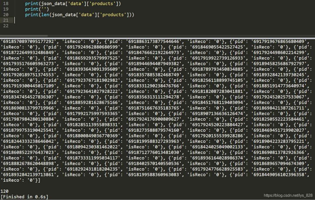 验证一下是否为全部商品数据量,也就是获取的商品的id数量(这里就是pid字段数据)是否等于120,代码如下