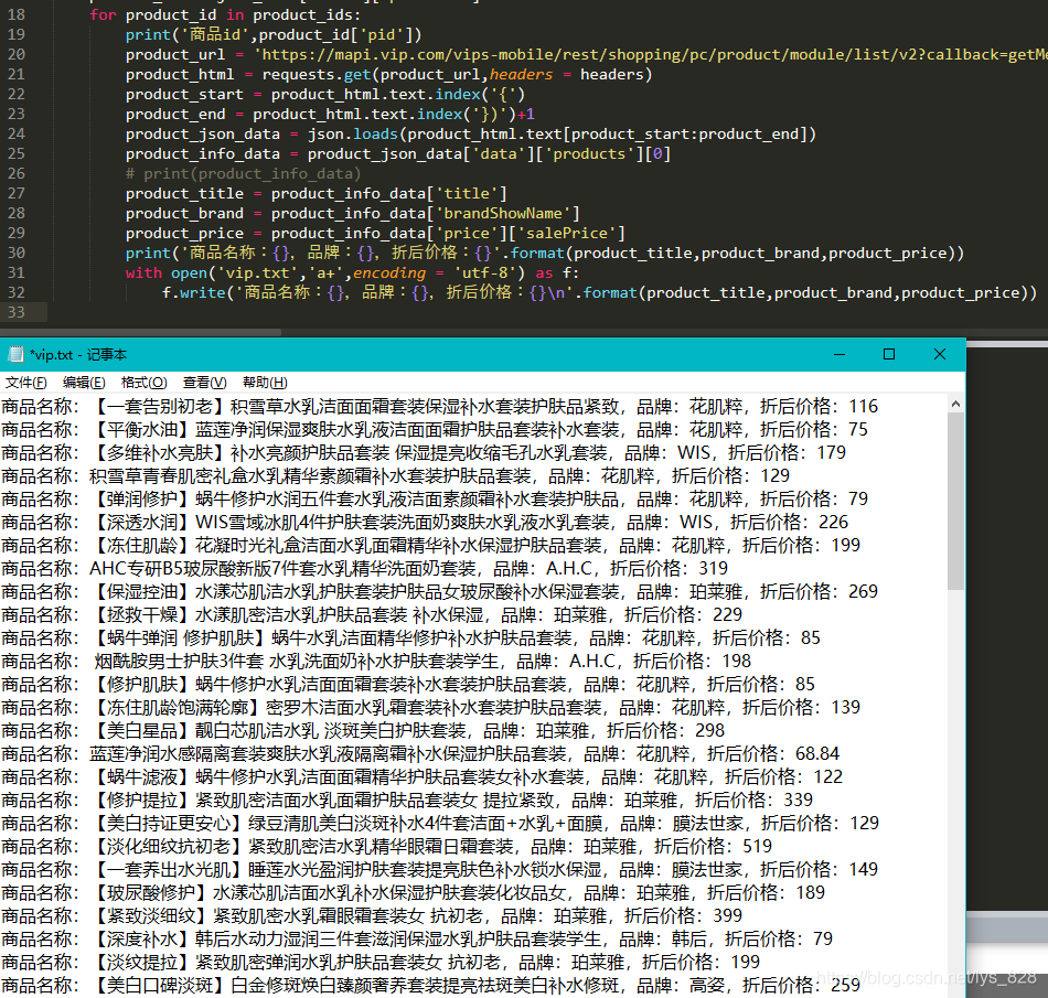 这里假使n=4,再次运行代码,输出的结果如下:(为了查看数据量,使用sublime打开txt文件,可以发现刚好是4页商品的数量总和,因此整个唯品会商品的信息的爬取至此完结)
