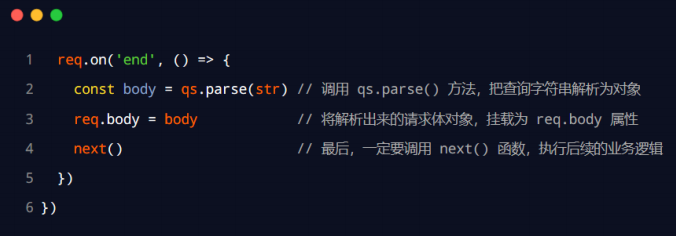 因此,我们可以在 req 的 end 事件中,拿到并处理完整的请求体数据。