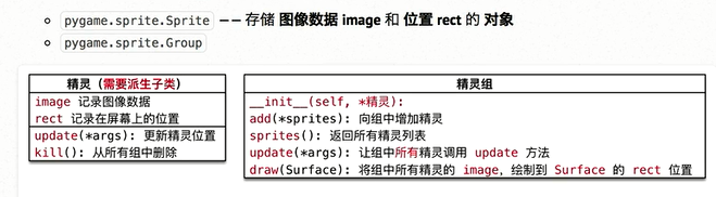 继承自pygame.sprite.Sprite类,包含image、rect、spped=1等属性和update()方法。