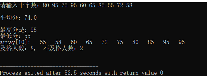 //求最高分,最低分,平均分,按大小排序 ,及格/不及格人数
