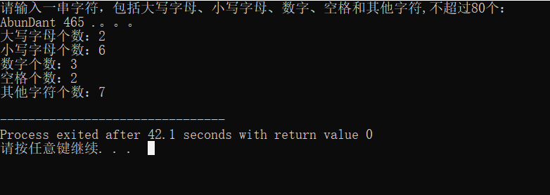 printf("请输入一串字符,包括大写字母、小写字母、数字、空格和其他字符,不超过80个:\n");