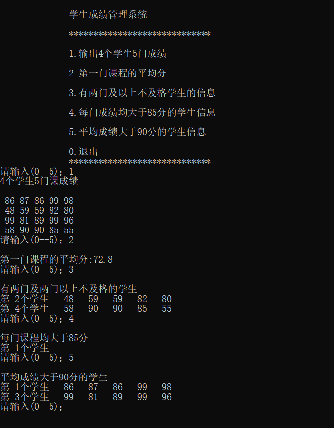 printf(" 1.输出4个学生5门成绩\n");