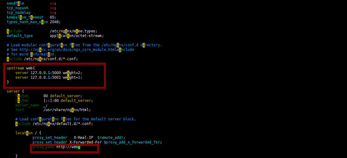 server 127.0.0.1:5000 weight=2; # weight权重。 访问2次5000就会访问一次5001端口