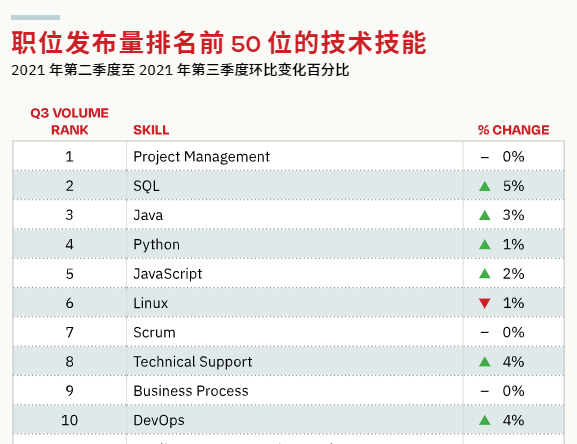 从截图中,我们可以清楚看到,项目管理能力在众多技术能力中排名第一,且是在SQL、Java、Python、Linux需求有所增长的情况下,仍旧稳居第一,这说明市场对项目管理能力的需求是非常大的。