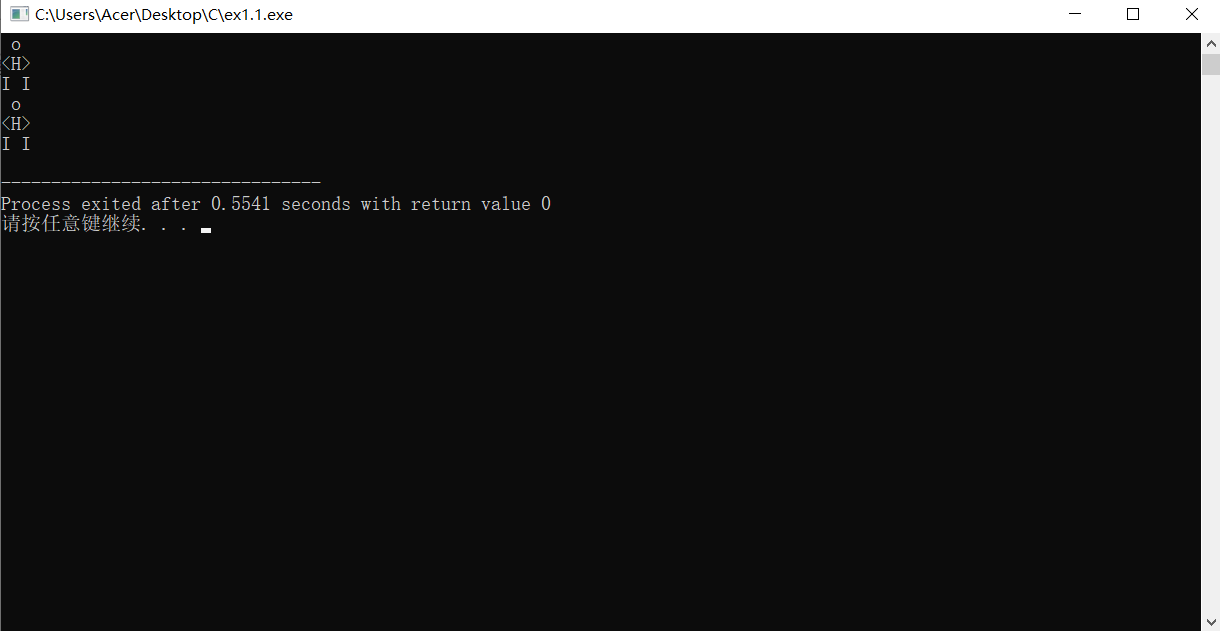 //打印一个字符小人 #include <stdio.h> int main() { printf(" o \n"); printf("<H>\n"); printf("I I\n"); printf(" o \n"); printf("<H>\n"); printf("I I\n"); return 0; }