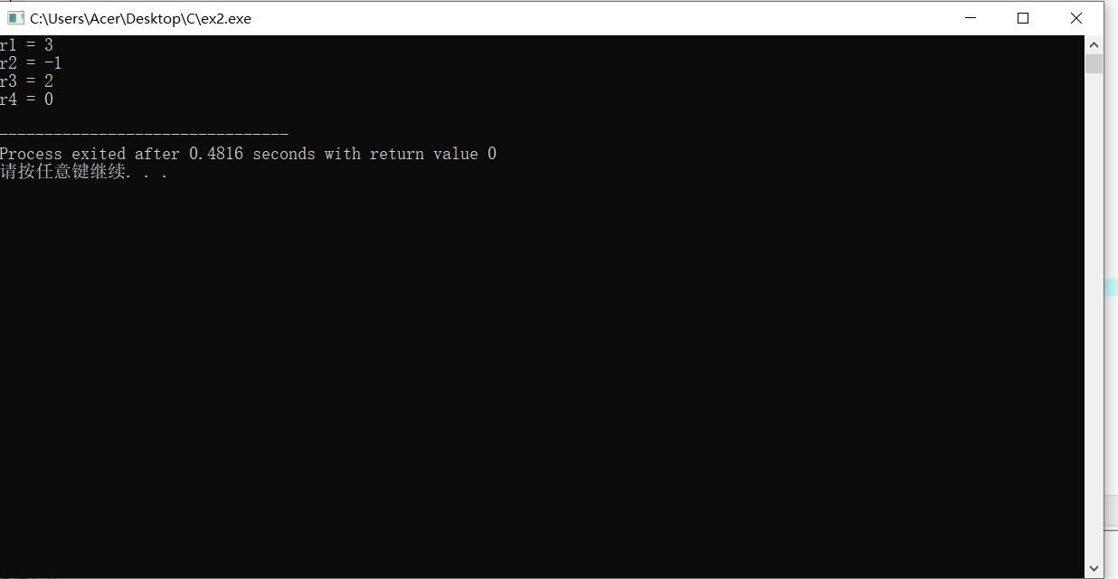 /* 用C语言实现一个简单的算术运算程序 */ #include <stdio.h> int main() { int x, y; //定义两个整型变量,用来保存运算数据 int r1, r2, r3, r4; //定义四个整型变量,用来保存加减乘除运算结果 x = 1; y = 2; r1 = x + y; r2 = x - y; r3 = x * y; r4 = x / y; printf("r1 = %d\n", r1); printf("r2 = %d\n", r2); printf("r3 = %d\n", r3); printf("r4 = %d\n", r4); return 0; }